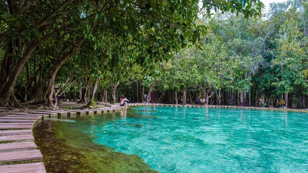 Hidden within the Thung Teao Forest, the Emerald Pool is a natural crystal-clear pond fed by warm mineral springs. The water glows a bright emerald and feels amazing after a day of exploring. A short walk takes you through forest trails, chirpy birds, and clear streams. Nearby is the Blue Pool, an otherworldly electric-blue spring (sometimes closed for conservation). Go early to enjoy the pools before tour groups arrive.