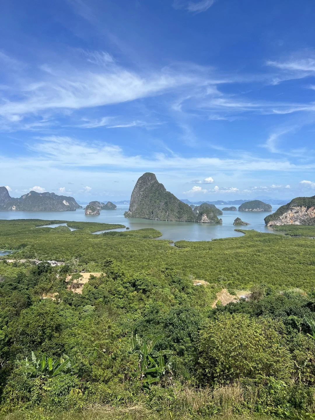 At the top, you’ll find sweeping views across the Andaman Sea, Hong Islands, and rugged limestone ranges. The viewpoint is famous for a rock ledge where travelers take dramatic photos perched above the landscape. But the real beauty lies in the breadth of the panorama: miles of wild Thailand unfolding under you.
